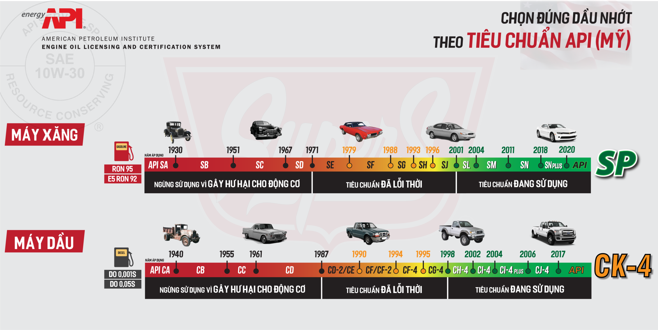 - Động cơ xăng: Các cấp chất lượng là SA, SB, SC, SE, SF, SG,… và cấp mới nhất là API SN.